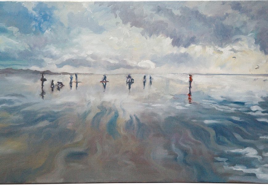 This is “Beach Ensemble” an early oil painting showing surfers getting ready on the beach at Saunton Sands. Completed and dated 2012 it’s part of a set of oils from a set of beach paintings.